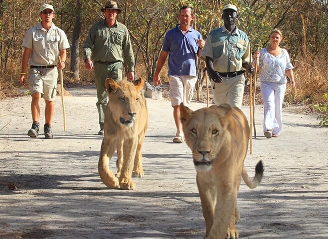 Venez vivre une expérience unique en marchant aux côtés de lions dans la Réserve de Fathala